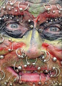 ↓当今世界最恐怖的一张脸据报道,《吉尼斯世界纪录》官方日前认定,英国一位78岁的男子凭借全身穿孔241处,被认定为是世界上全身穿孔最多的人。78岁的约翰·林奇来自英国赫特福德郡,是一位退休的银行经理。