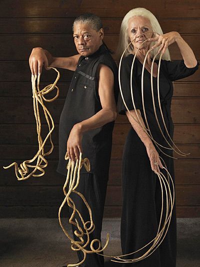 ↓当今世界指甲最长的男人和女人现年68岁,来自美国犹他州盐湖城的妇女李·雷蒙德自1979年起就开始留手指甲,2006年,她作为世界上指甲最长的女性被收入吉尼斯世界纪录。2008年她的指甲总长度已达到8.65米,右手大拇指指甲在10个指头中最长,约为0.9米。然而,2009年2月的一场车祸,让她留了30年的指甲被撞断,失去了自己引以为豪的标志。当时,4辆车连环相撞,雷蒙德从休旅车内被甩出车外,身体受到重伤,10个指甲也全部被损毁。左侧男子为目前世界最长指甲纪录保持者
