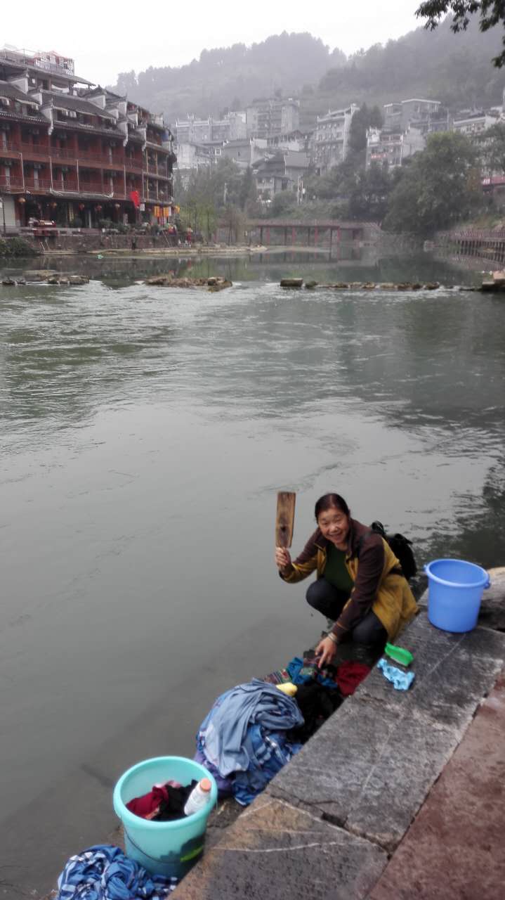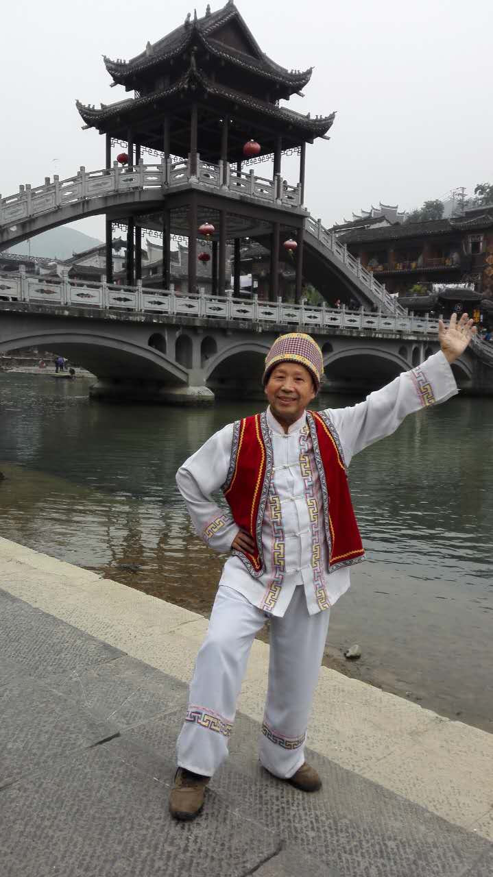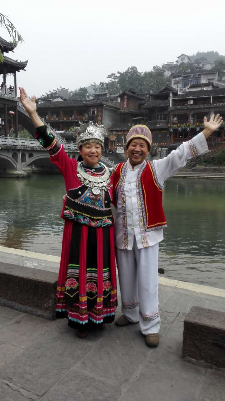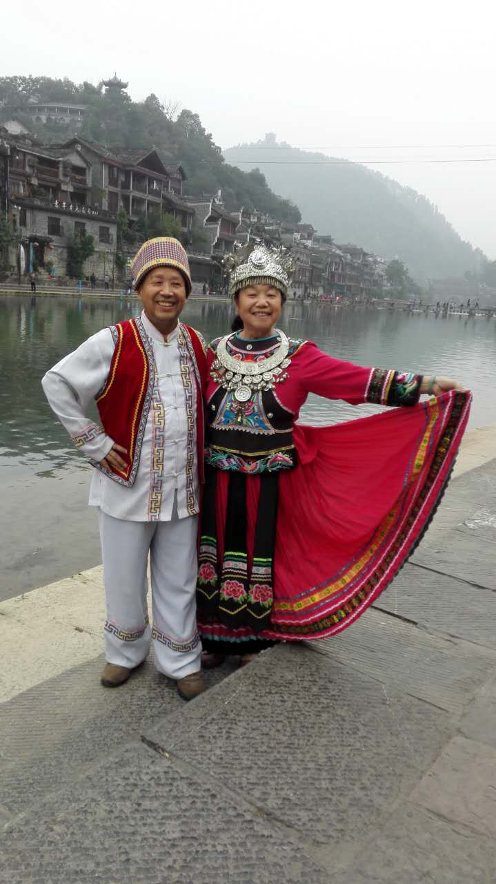10月25日上午10点,周大荣携妻子吴昌祥从张家界乘长途大巴车到达本次秋冬漫游南国的第二站,湖南湘西迷人的凤凰古城。当天下午,兴致勃勃地游览保存完好、古色古香、耳目一新的凤凰古街。一边游览一边选景拍照,还穿上苗族的传统服装,照了几张喜笑颜开的照片,作为永久的留念。晚上游览灯火辉煌的沱江夜景,沱江静静流淌,沿江两岸充满苗乡特色的吊脚楼商店、酒巴、餐厅、歌舞厅林立,游人如织,一片繁荣景象。五彩灯火交相辉映,美不胜收,真是令人如痴如醉,流连忘返。