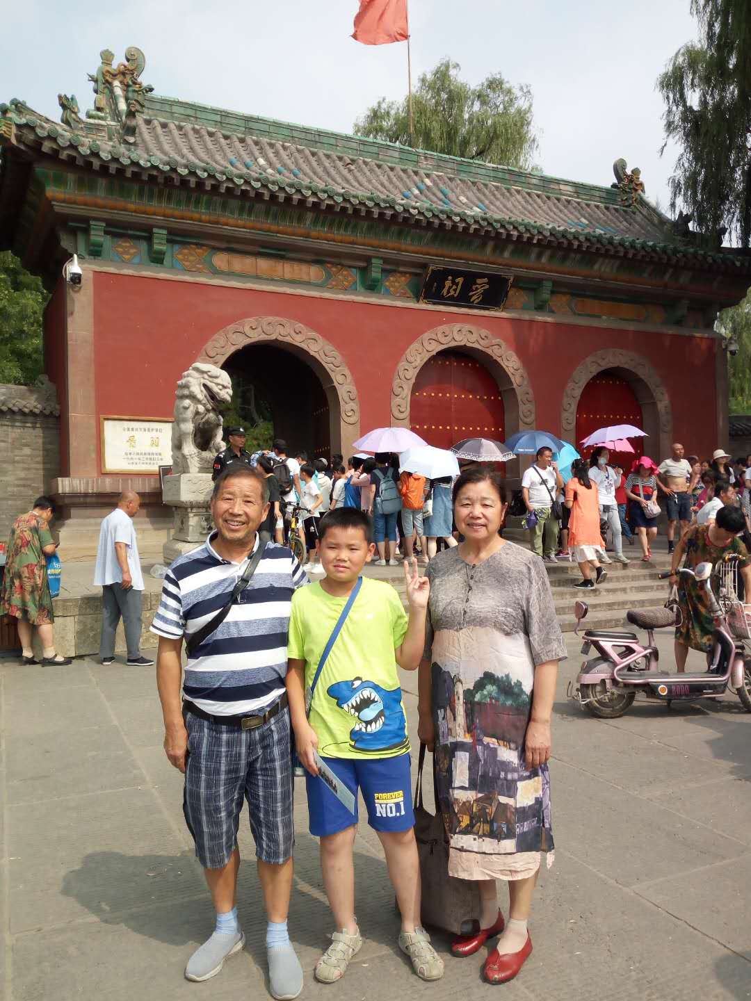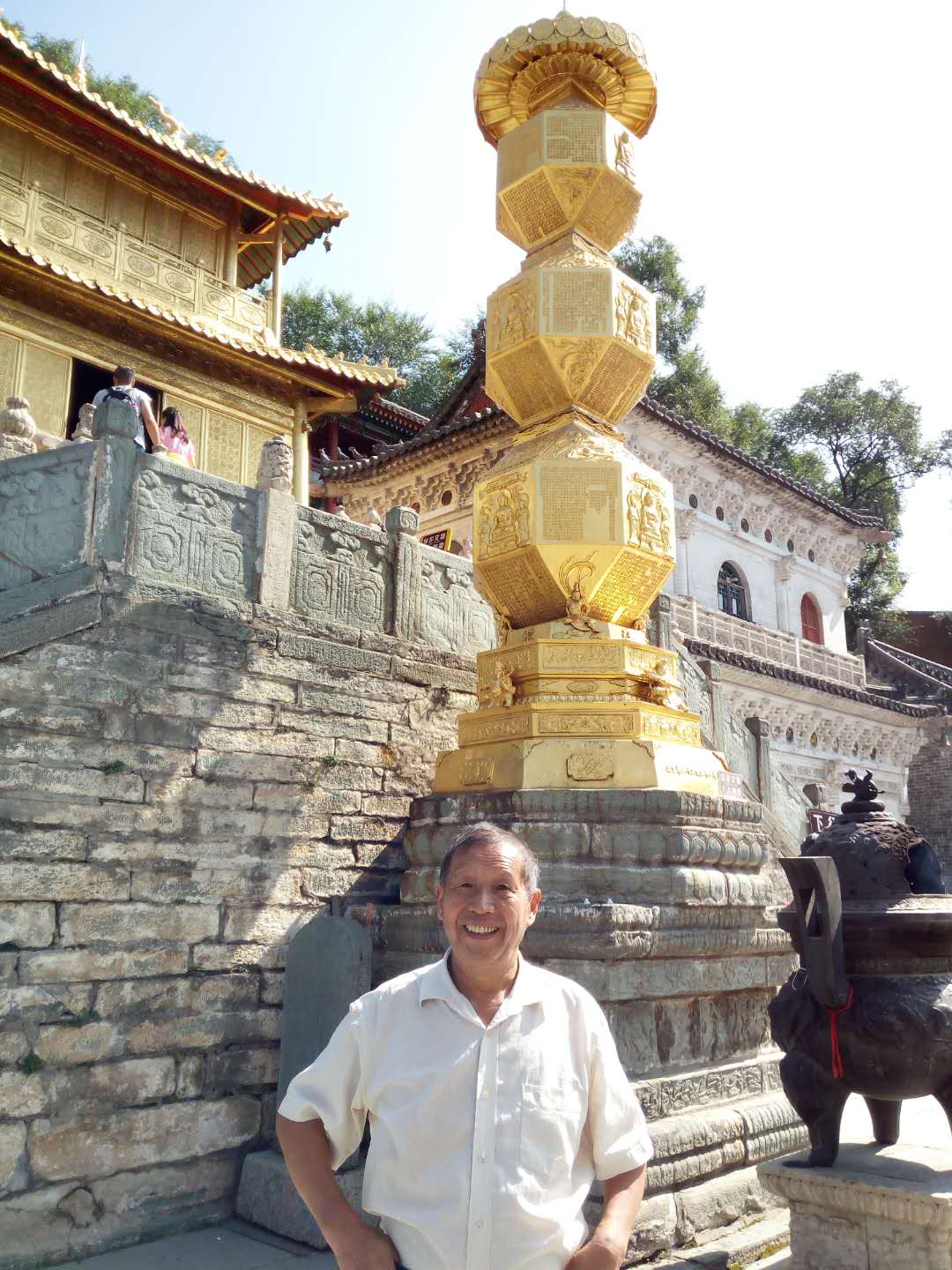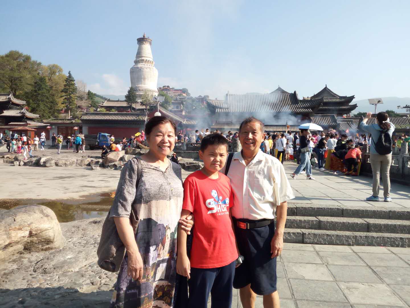 7月28日中午,周大荣携妻子吴昌祥和孙子周裕荃从太原东客站乘坐长途大巴车前往著名的武台山风景区台怀镇。武台山是中国4大佛教名山之首,世界自然与文化遗产,国家首批5A级旅游景区,各种寺庙星罗棋布。由于正是旅游旺季,景区游客和烧香拜佛的信徒众多,车辆川流不息,交通拥堵严重。7月29日上午7点半,选择了五爷庙、塔院寺、显通寺、殊像寺等主要景点游览。这些著名景点看上去雄伟壮观、香火旺盛,但感觉真正的原始文物并不多,大多数是近10多年来改扩建的仿文物。武台山风景区天气凉爽,早晚要穿外套长裤,晚上要盖棉被,是夏季避暑的好地方。